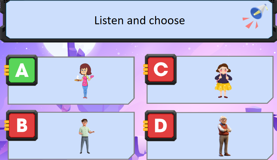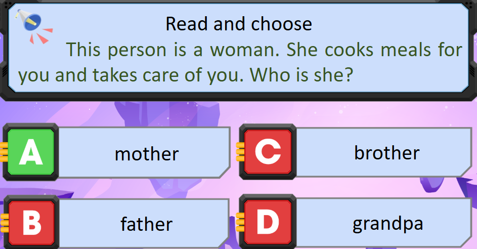 Giải thích: This person is a woman. She cooks meals for you and takes care of you. Who is she?: Người này là một phụ nữ. Cô ấy nấu bữa ăn cho bạn và chăm sóc bạn. Cô ấy là ai?