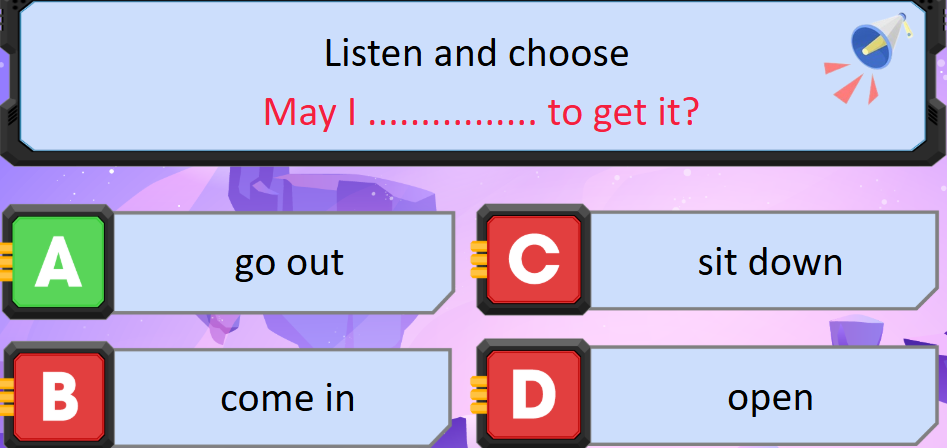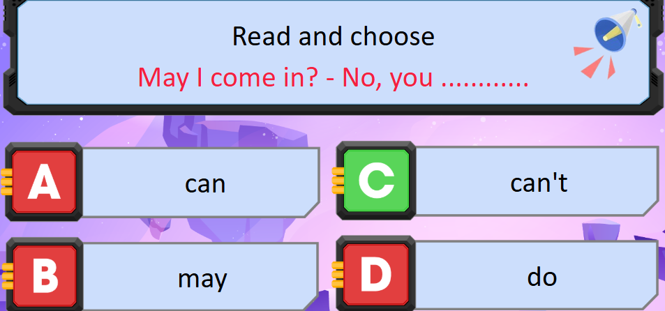 Giải thích: May I come in? - No, you can't: Em có thể ra ngoài không? - Không được nhé.