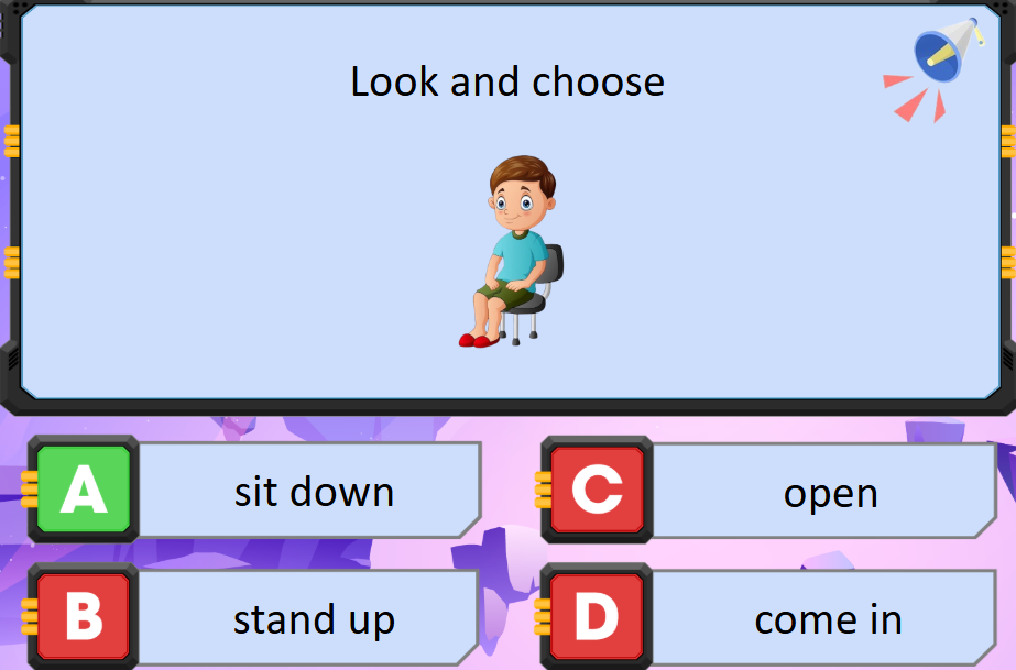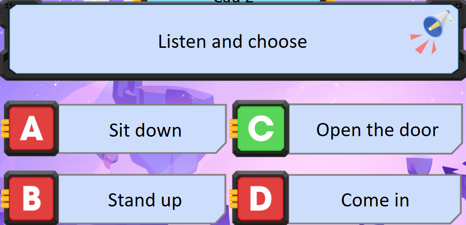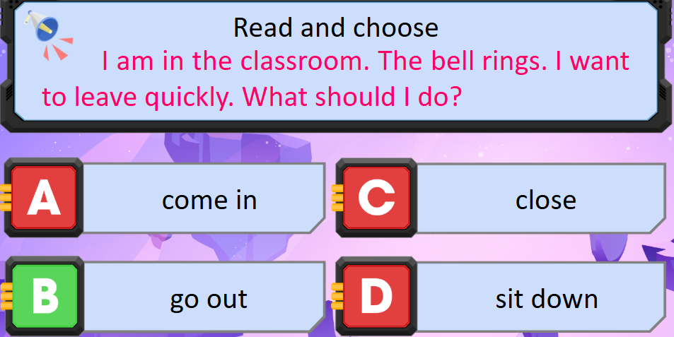 Giải thích: I am in the classroom. The bell rings. I want to leave quickly. What should I do?: Tớ đang ở trong lớp học. Tiếng chuông reo. Tớ muốn ra ngoài nhanh. Tớ nên làm gì?