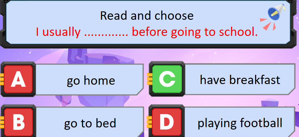 Giải thích: I usually have breakfast before going to school.: Tớ thường ăn sáng trước khi đi học.
