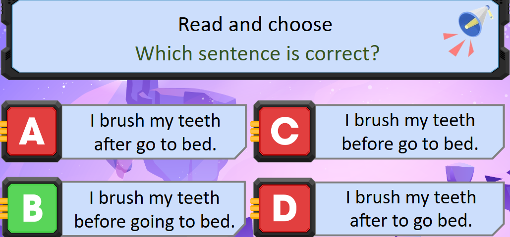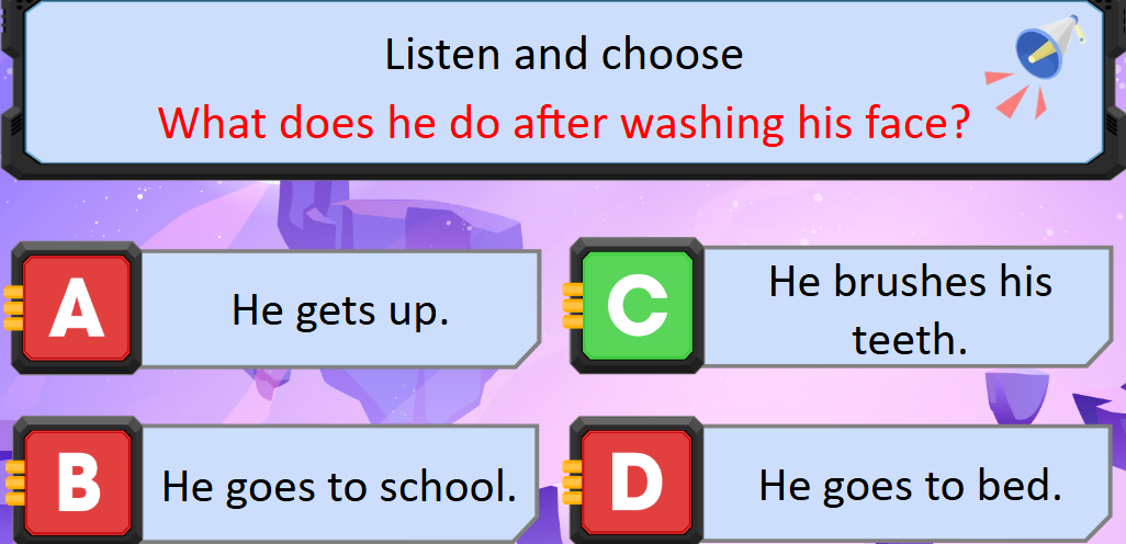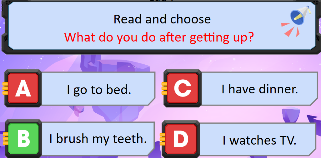 Giải thích: What do you do after getting up? - I brush my teeth.: Bạn làm gì sau khi thức dậy?” – “Tớ đánh răng.