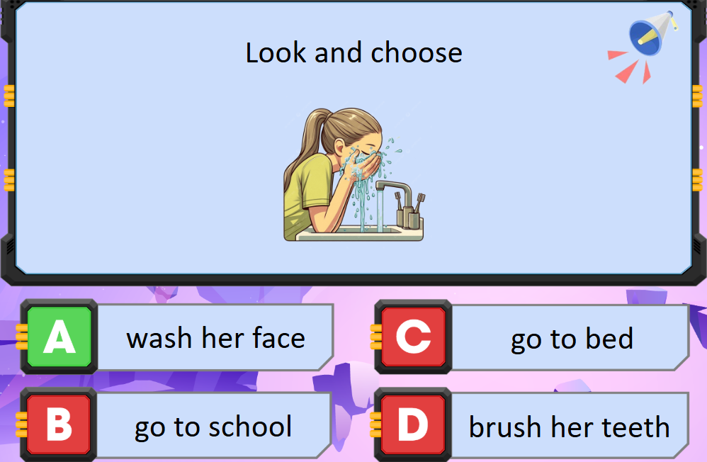 Giải thích First, I get up. Then I wash my face. Next, I brush my teeth. After that, I have breakfast.: Đầu tiên, tớ thức dậy. Rồi tớ rửa mặt. Tiếp theo, tớ đánh răng. Sau đó, tớ ăn sáng.”
