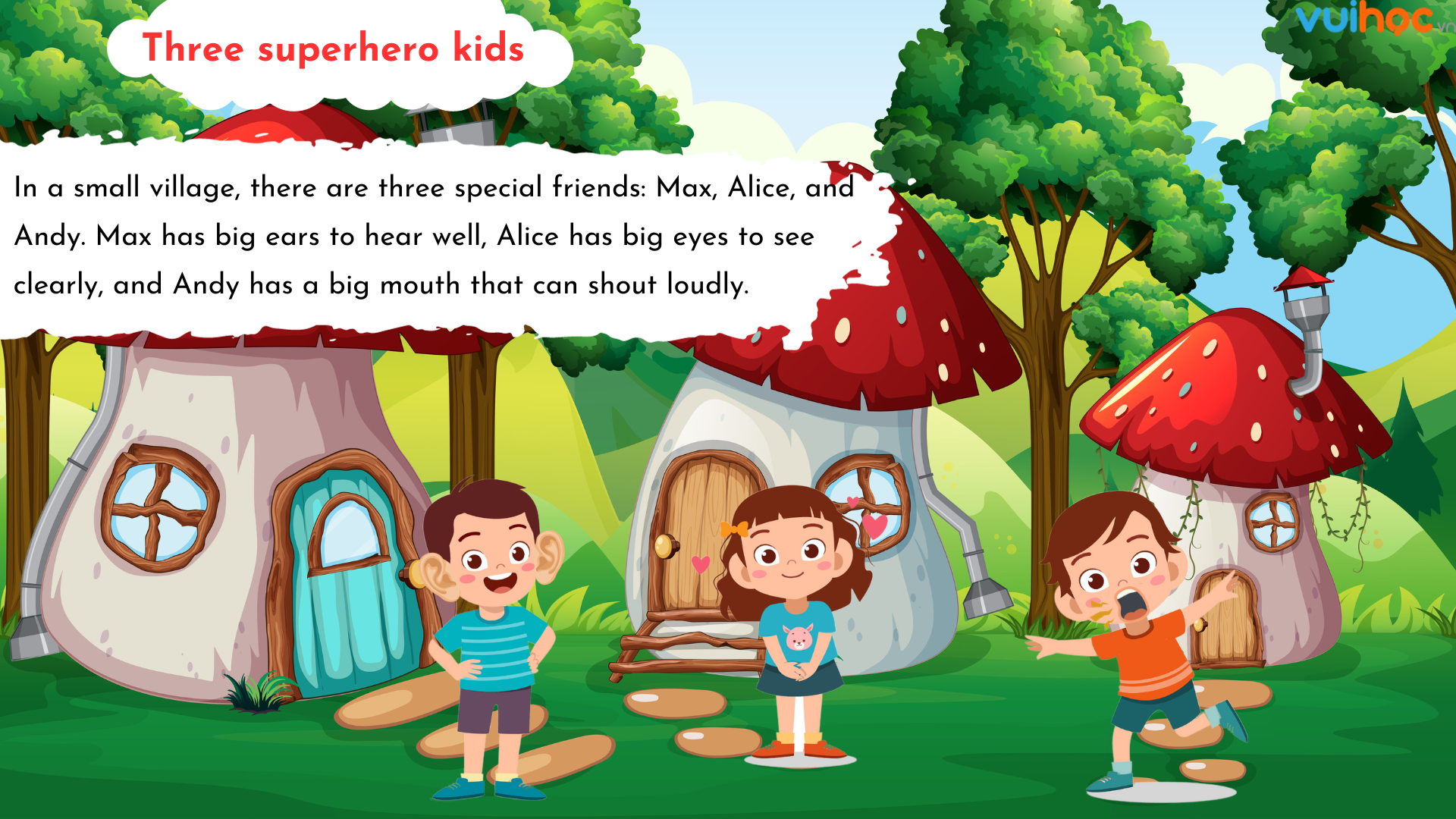 1. In a small village, there are three special friends. Max, Alice, and Andy. Max has big ears to hear well, Alice has big eyes to see clearly, and Andy has a big mouth that can shout loudly.