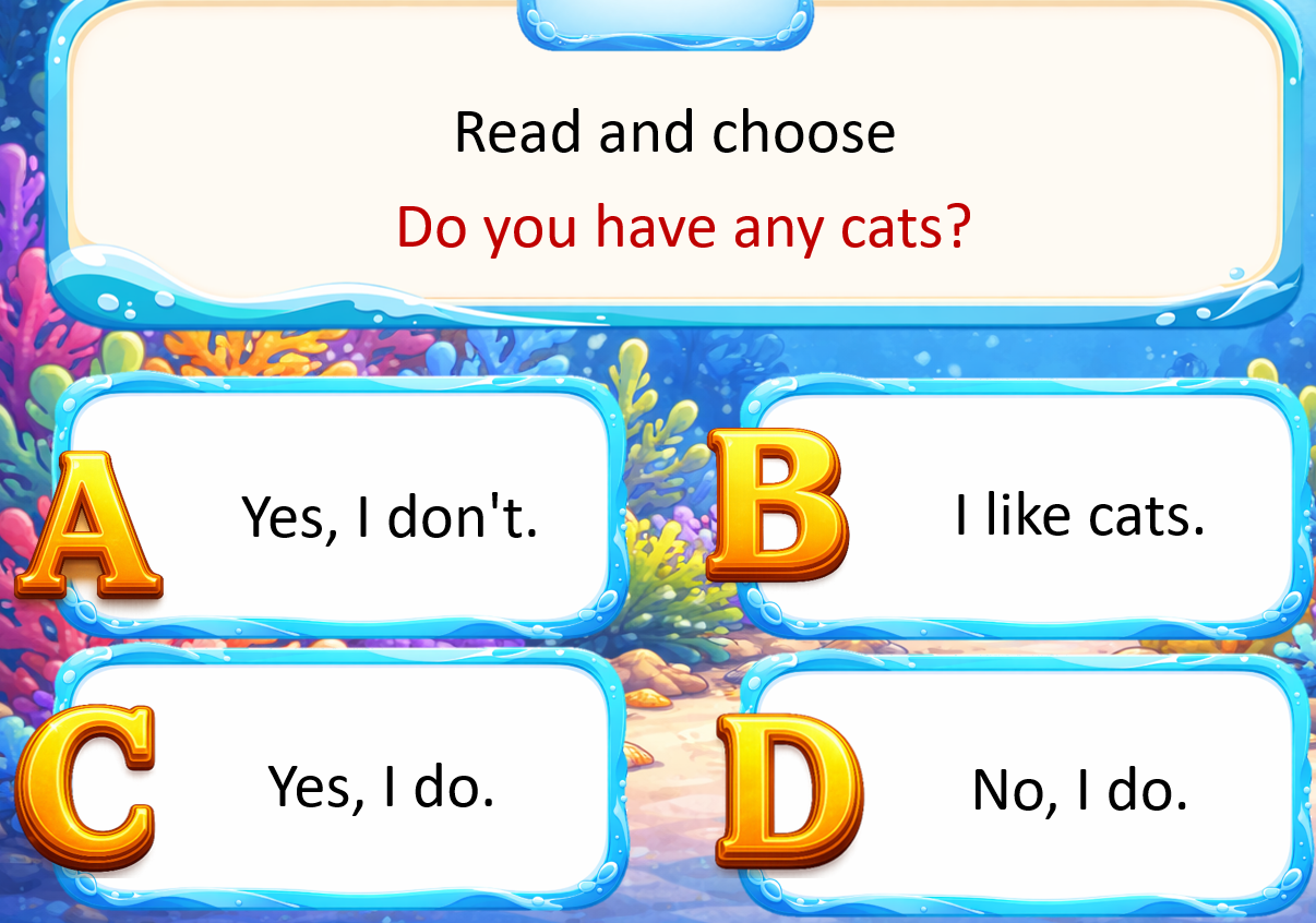 Giải thích: Do you have any cats?: Bạn có con mèo nào không?
